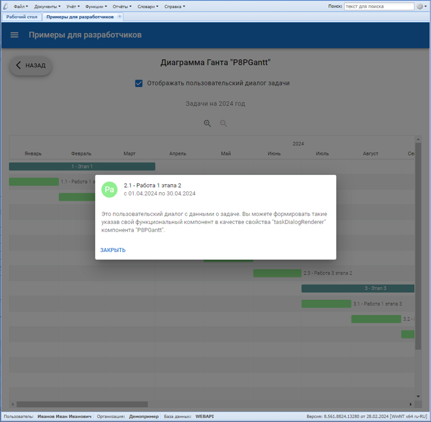 • объекты PKG_P8PANELS_SAMPLES, P8PNL_SMPL_CYCLOGRAM и P8PNL_SMPL_GANTT - обеспечивают работу панели "Samples" ("Примеры для разработчиков"). Это абстрактный набор примеров применения фреймворка, не привязанный жестко к комплектации Системы. Должен откомпилироваться практически в любой комплектации Системы (единственное требование - наличие словаря "Контрагенты").